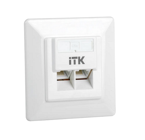 ITK Внутренняя информационная розетка RJ45 кат.5E UTP 2 порта, предназначенная для подключения оконечного оборудования пользователей на рабочих местах к информационной сети; Категория:5E; Рабочая частота:100 МГц; Номин ток:1,5 А; Защита:IP20; Размеры:9 см х 9 см х 6 см; Вес:0.14 кг.; Цвет:Белый.